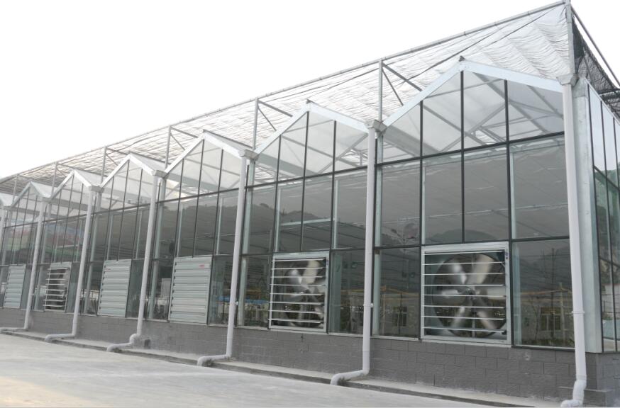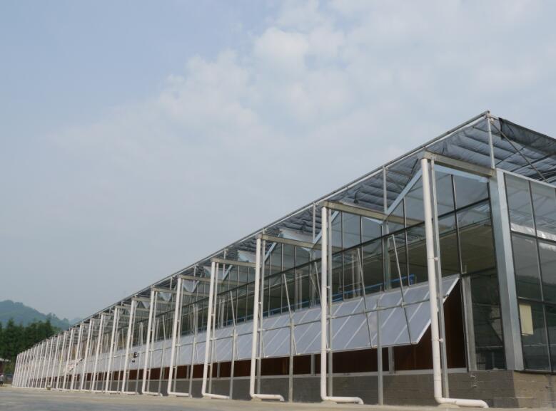 覆蓋材料為國產4mm或5mm厚浮法玻璃,其透光率〉90%。溫室頂部及四周為專用鋁型材。側面和端面也可采用單層、雙層或中空玻璃為覆蓋材料