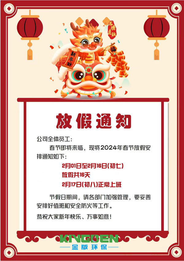 春節(jié)放假時(shí)間為2024年2月1日至16日放假。2月17日(初八)上班。請(qǐng)大家合理安排好工作和生活,確保度過(guò)一個(gè)愉快、祥和的春節(jié)。