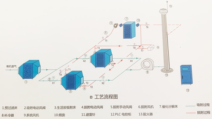活性炭吸附飽和后,利用熱空氣講活性炭?jī)?nèi)的有機(jī)物脫附出來(lái),通過(guò)控制脫附過(guò)程流量可將有機(jī)物廢氣濃度濃縮10-20倍,脫附氣流經(jīng)催化床內(nèi)設(shè)的電加熱器加熱至需要的溫度,在催化劑作用下有機(jī)廢氣開始分解,催化分解過(guò)程凈化效率可達(dá)97%以上,分解后生成二氧化碳和水并釋放出大量的熱量,該熱量通過(guò)催化分解床內(nèi)的熱交換器回收,一部分用來(lái)加熱脫附出的高濃度廢氣,另外一部分加熱室外來(lái)的空氣做活性炭脫附其他使用,再生處理系統(tǒng)靠廢氣中分解的有機(jī)廢氣做能源,在無(wú)須外加能源基礎(chǔ)上使再生過(guò)程達(dá)到平衡循環(huán),極大的減少能耗,并且無(wú)二次污染的產(chǎn)生,整套吸附和催化分解過(guò)程由PLC實(shí)現(xiàn)自動(dòng)控制。