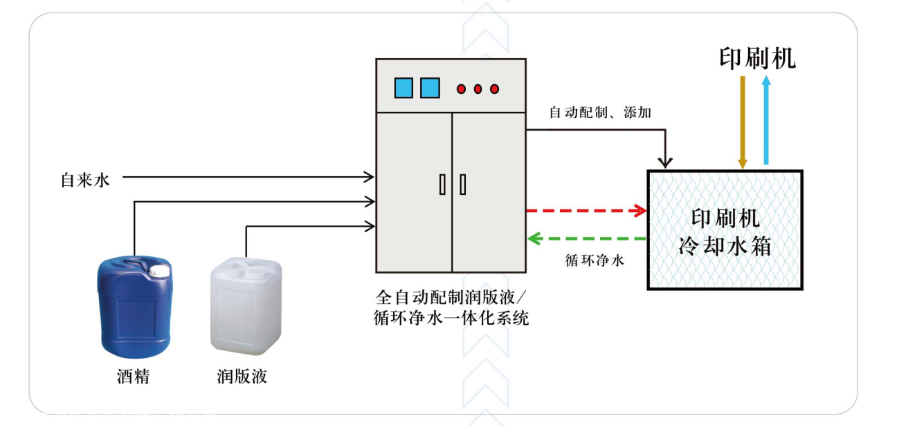 潤版液凈水過濾系統(tǒng),潤版液濃縮液、酒精(IPA)、自來水按一定的分量比例配置,混合后加到冷卻箱內(nèi),比起PH值管理或電導率管理的配置方式潤版液濃度更精.準、穩(wěn)定??蛇x擇加酒精和免酒精。