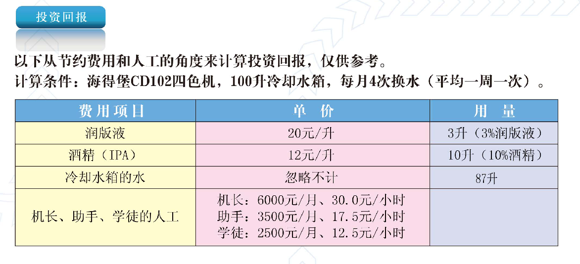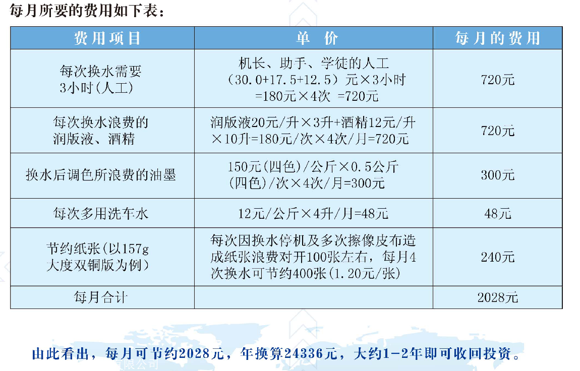2.不需要經(jīng)常停機換水,清洗水箱,減少了水、潤版液、IPA(異丙酮)的使用量,降低生產(chǎn)成本,清潔的水質(zhì)保持印刷機水管暢通,防止堵塞,減少維護時間和成本。